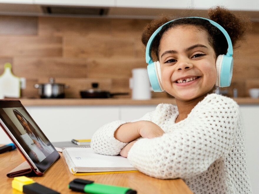 Link da imagem: https://br.freepik.com/fotos-gratis/vista-lateral-da-menina-sorridente-durante-a-escola-online-com-tablet-e-fones-de-ouvido_12228755.htm A educação à distância no atual momento da pandemia ainda é um desafio para muitas
